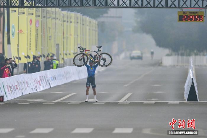 图为100千米须眉组48号选脚旧浩领先冲过止境,并举起本身的参赛自止车庆祝。中新社记者 刘忠俏 摄